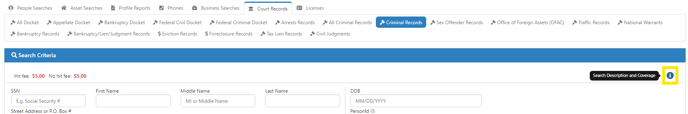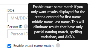 There are different search criteria options available, depending on what information you have on your subject. However, more jurisdictions seem to be moving to redact personally identifiable information, like social security numbers, dates of birth, and address information, from their records for the sake of the individual's privacy. If the jurisdiction has redacted the SSN and/or DOB from their records, and you run the search by SSN or DOB, then it may return a no records found response. Therefore, to get the broadest search to try to find all possible records for your subject, Less is More. It is best practice to run the All Criminal Records search by name only. If your subject has a common name like Smith, you may need to narrow the scope of the search by adding more information, like a state. You can also select to enable exact name match, if you only want the exact name you entered to be returned, and no partial name matches or spelling variations.