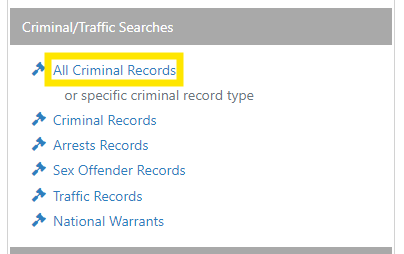 The Criminal Package search is a combination search, which includes the Arrest Records, Criminal Records, Sex Offender Records, National Warrants, and Traffic Records searches in one. The individual search descriptions for each coverage list still applies.