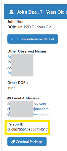 - Sometimes relatives, especially those that have similar names and shared address history, may be mixed into one Person ID and listed under "Other Observed Names." It is necessary to perform due diligence with any records obtained through a database to verify the information returned.