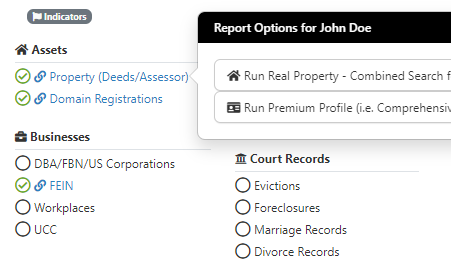 Similarly, when you click on a hyperlink within your search, such as with the indicators, or when you run a Comprehensive Person Report, it will run by the Person ID. The records returned in these searches can match by the subject's name, or other observed name(s), and addresses.