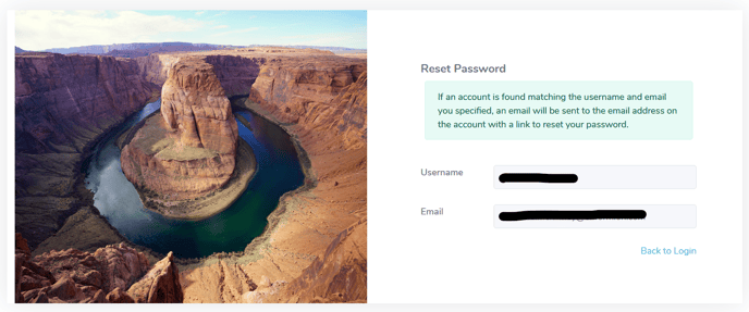 After you enter the correct username and email address on file for your account, click the submit button. You will see a message stating an email has been sent to you.